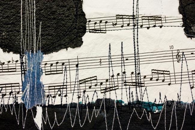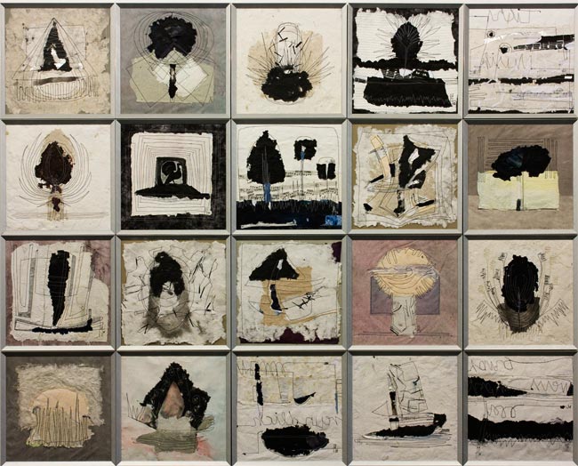 Sentenzen / 2011 handgeschöpftes Papier, Japanpapier, genäht / 20 Teile, je 30 x 30 cm, gesamt 150 x 120 cm