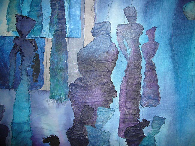 Werden und Vergehen / 2003 handgeschöpftes Papier auf Gaze und Baumwolle, gefärbt, genäht / 120 x 195 cm