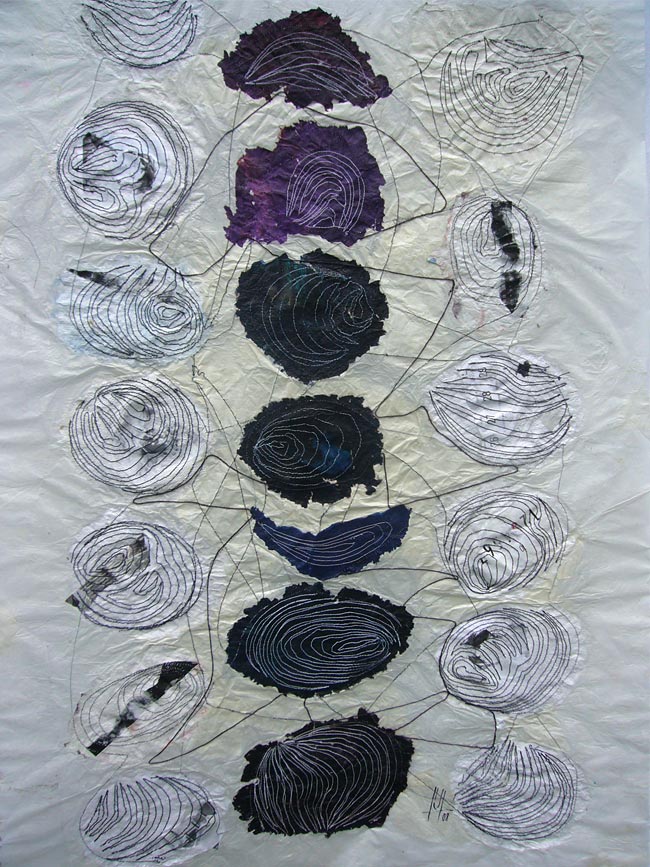 handgeschöpftes Papier, auf Japanpapier, gefärbt, genäht / 70 x 100 cm