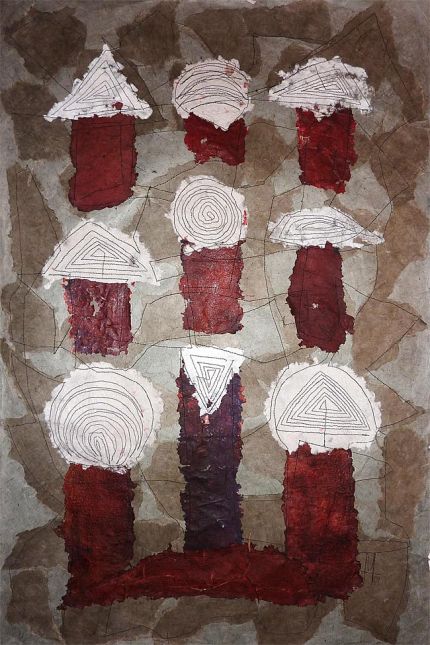 handgeschöpftes Papier auf Japanpapier, gefärbt, genäht / 49 x 75 cm