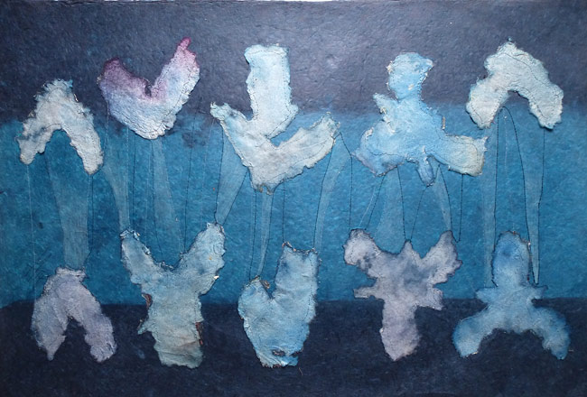 handgeschöpftes Papier auf Lederpapier, gefärbt, genäht / 70 x 50 cm