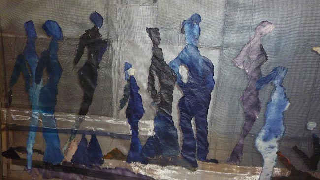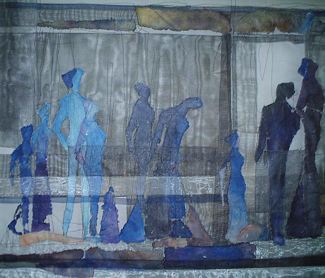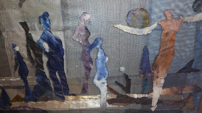 handgeschöpftes Papier und Organza auf Gaze, gefärbt, genäht / 200 x 117 cm