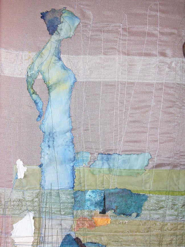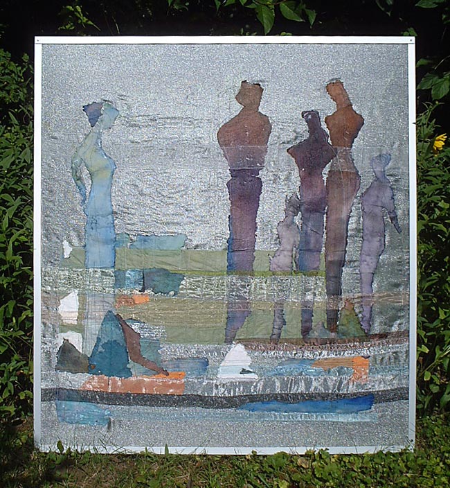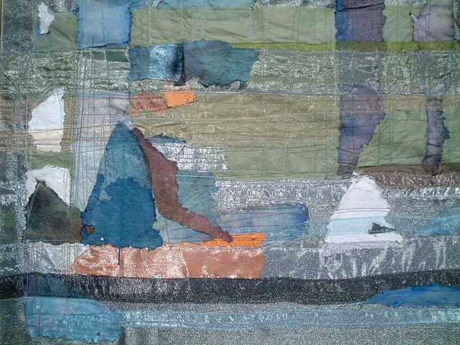 handgeschöpftes Papier und Organza auf Gaze, gefärbt, genäht / 105 x 116 cm