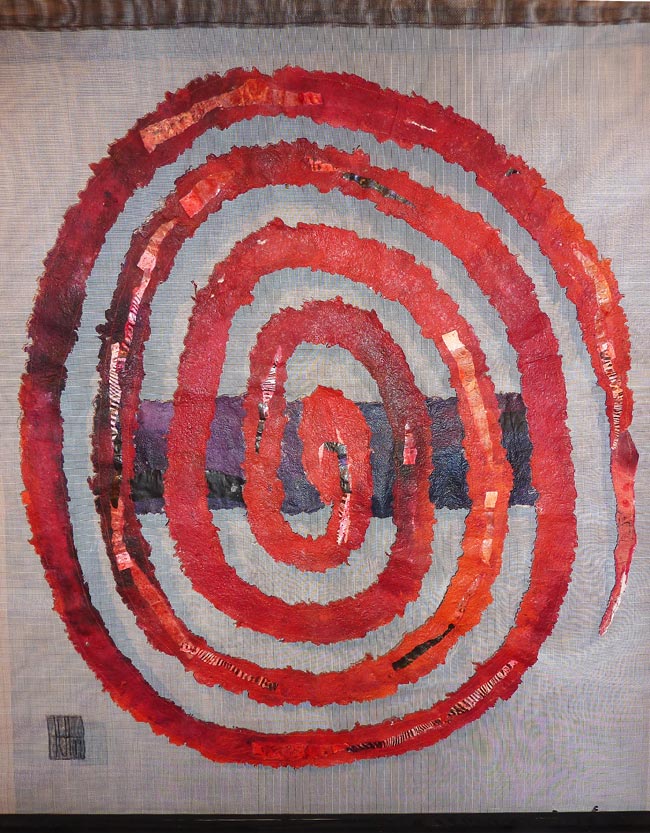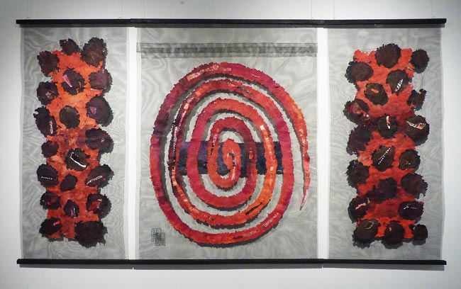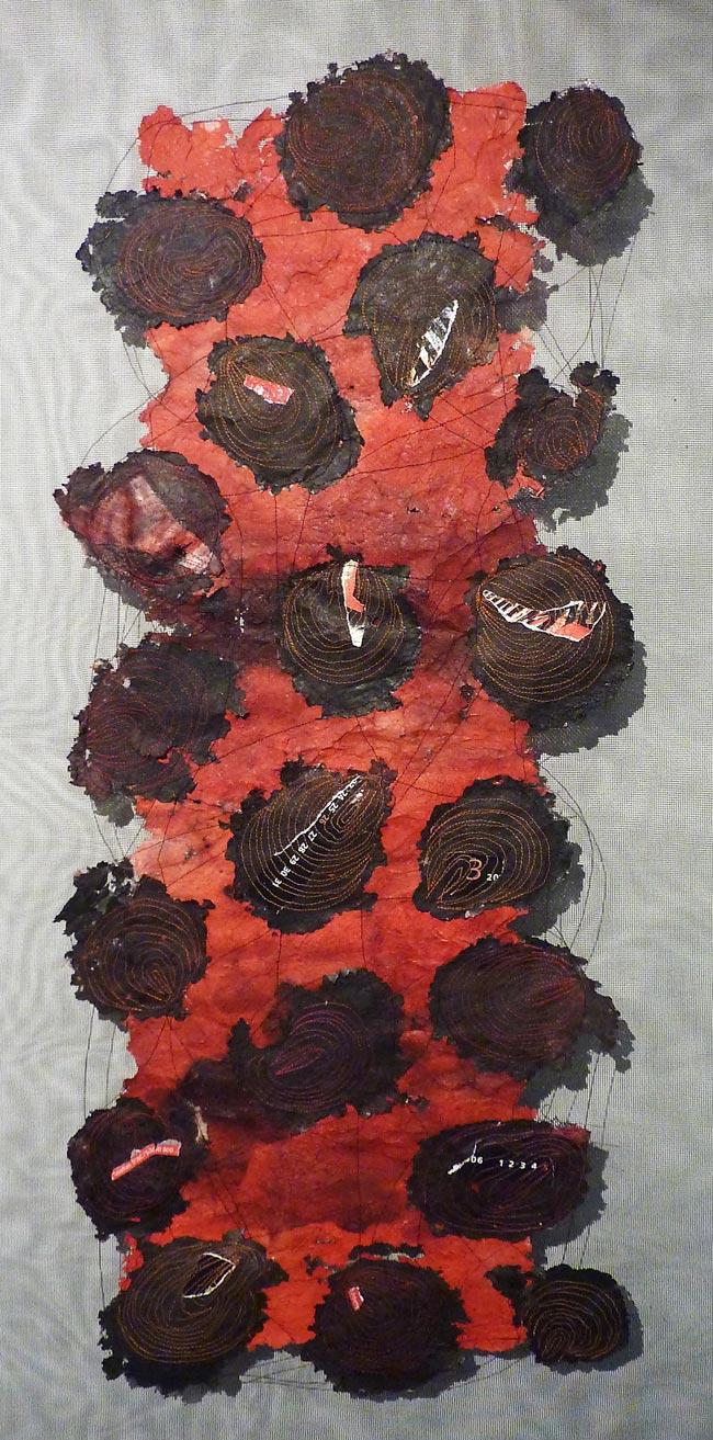 handgeschöpftes Papier auf Gaze, gefärbt, genäht / 280 x 94 cm
