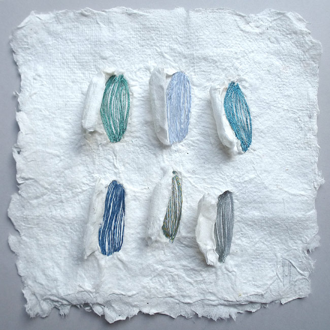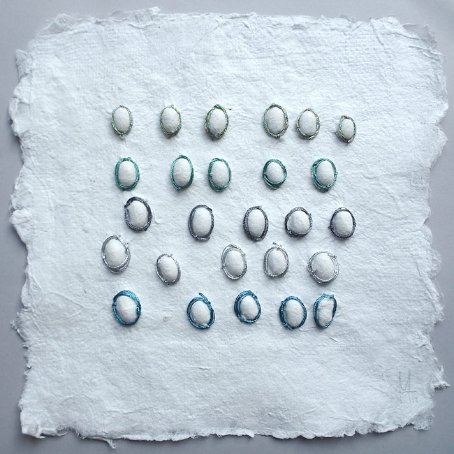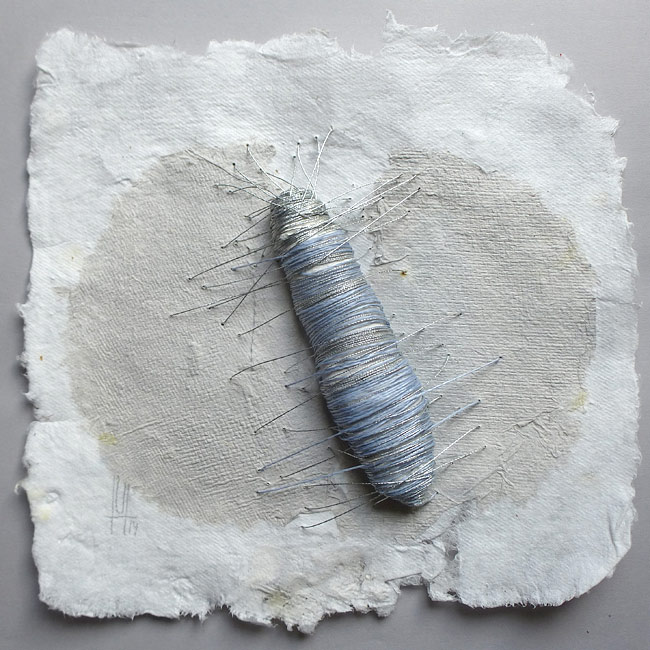Metamorphose / 2014Handgeschöpftes Papier, Alterfilfaden, genäht, geklebt / 25 x 25 cm