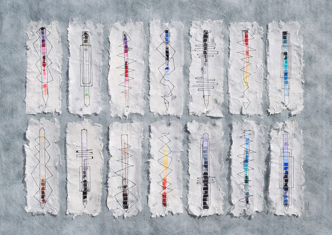 handgeschöpftes Papier und Farbsegmente auf Vlies, gefärbt, genäht / 90 x 70 cm